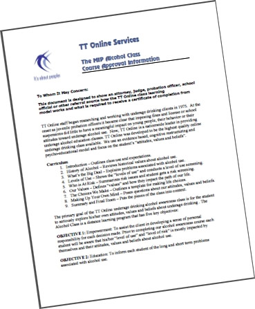 Frankly, most courts, agencies, schools or other referral sources accept a Outcome Alternatives® underage drinking class without question. However, if you want to be sure our alcohol education class is acceptable to the person who referred you, the attached document can be submitted to the referral person to help explain and outline our underage drinking class curriculum. Interested in our "Court/School Approval" document? ![]()